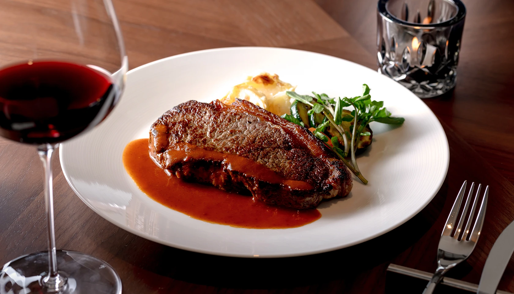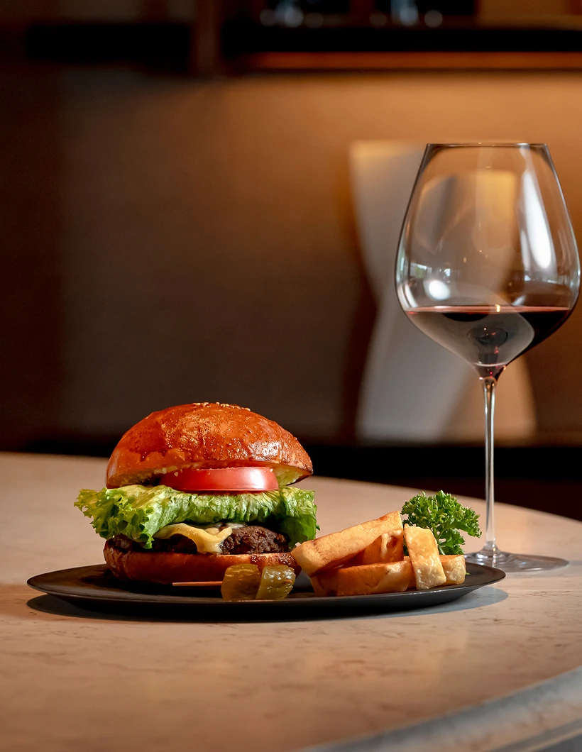 料理は和洋折衷。朝の軽やかな一皿から、ラウンド後にしっかりお腹を満たすメインまで、幅広いスタイルでご用意します。シグネチャーのハンバーガーは、国産牛100%のパティに、隣接した自社ベーカリーで焼き上げたバンズを合わせたここだけの一品。噛みしめるほどに肉の旨味と香ばしさが広がります。さらに臭みがなく脂は控えめなグラスフェッドのサーロインステーキは、赤身の澄んだ旨味が際立つ軽やかな後味で食後の余韻まで美しく整えます。