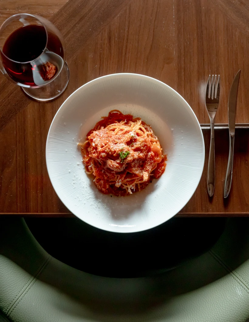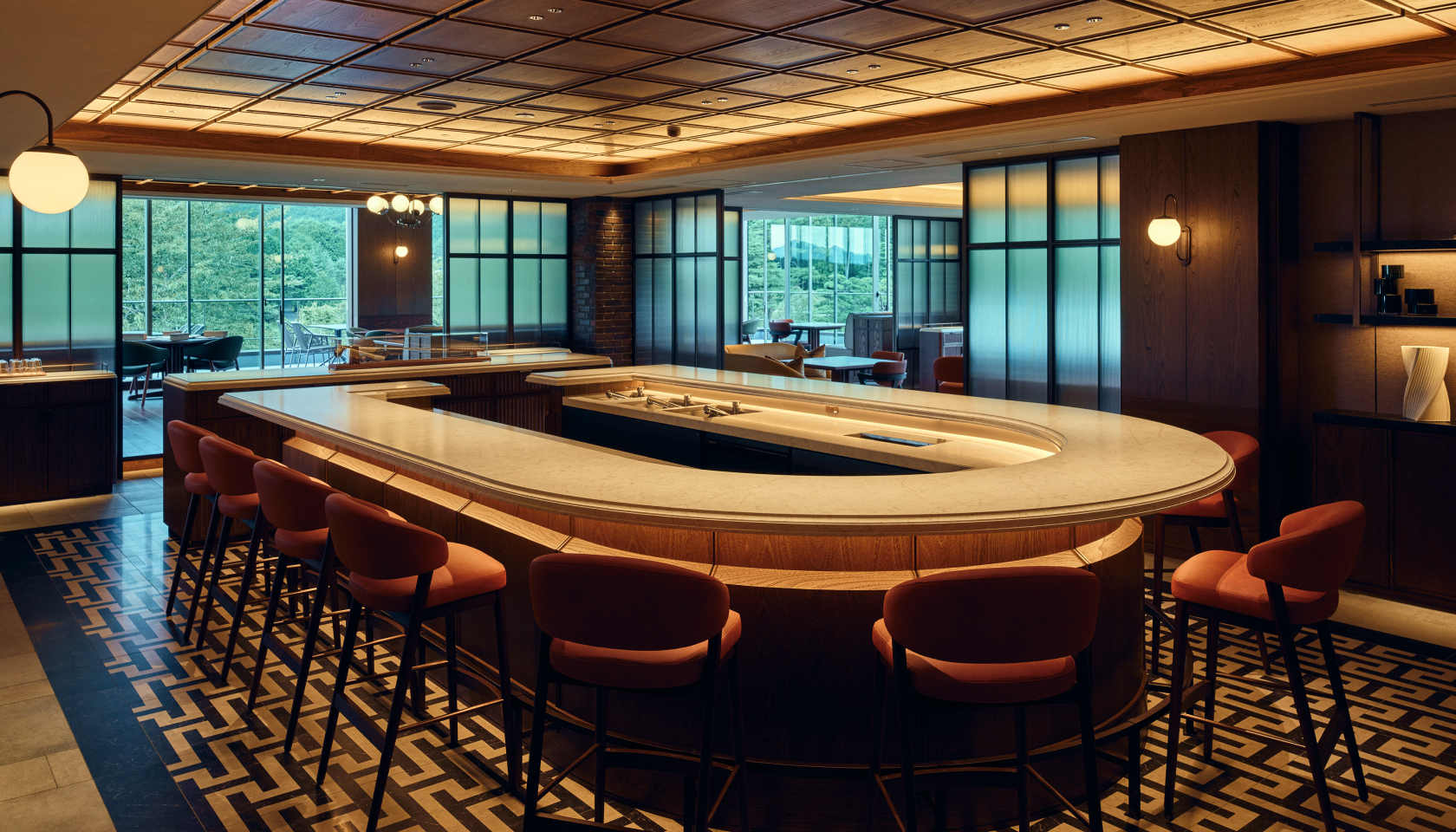 室内はクラシカルな重厚感とモダンの洗練が共存する設え。煉瓦の温かな陰影と杢(もく)の自然で重厚な風合い、そして大理石の美しい模様が響き合い、欧州のグランド・サロンを思わせる格調高い空気を醸成します。歴史あるクラブハウスの趣に寄り添いながら、現代的な快適性と審美を同居させた、品位あるダイニング体験をお楽しみいただけます。