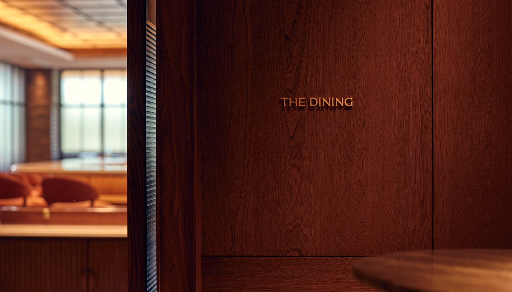 煉瓦と杢、大理石が響き合う、名門クラブの格調を宿す食の間。