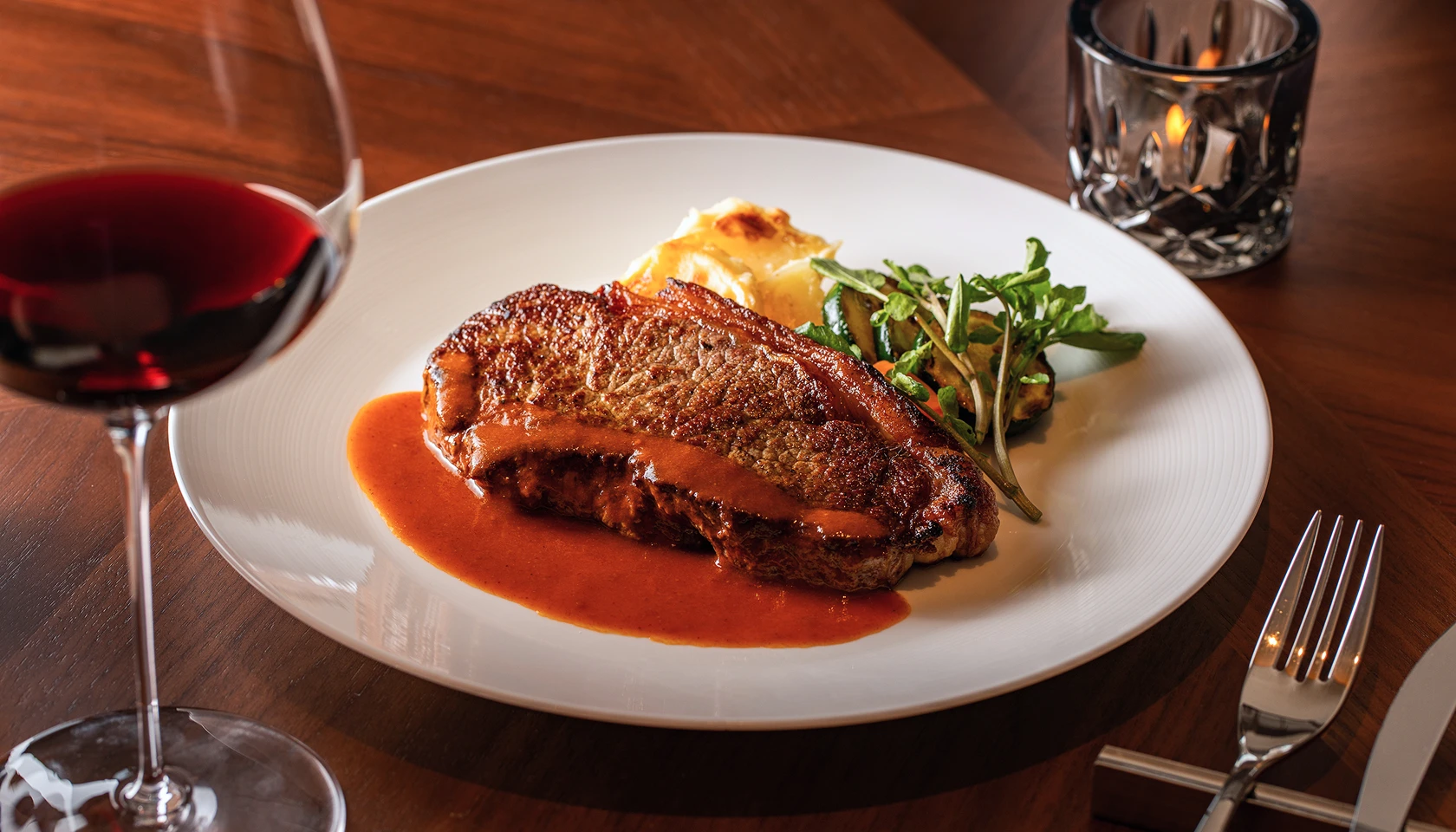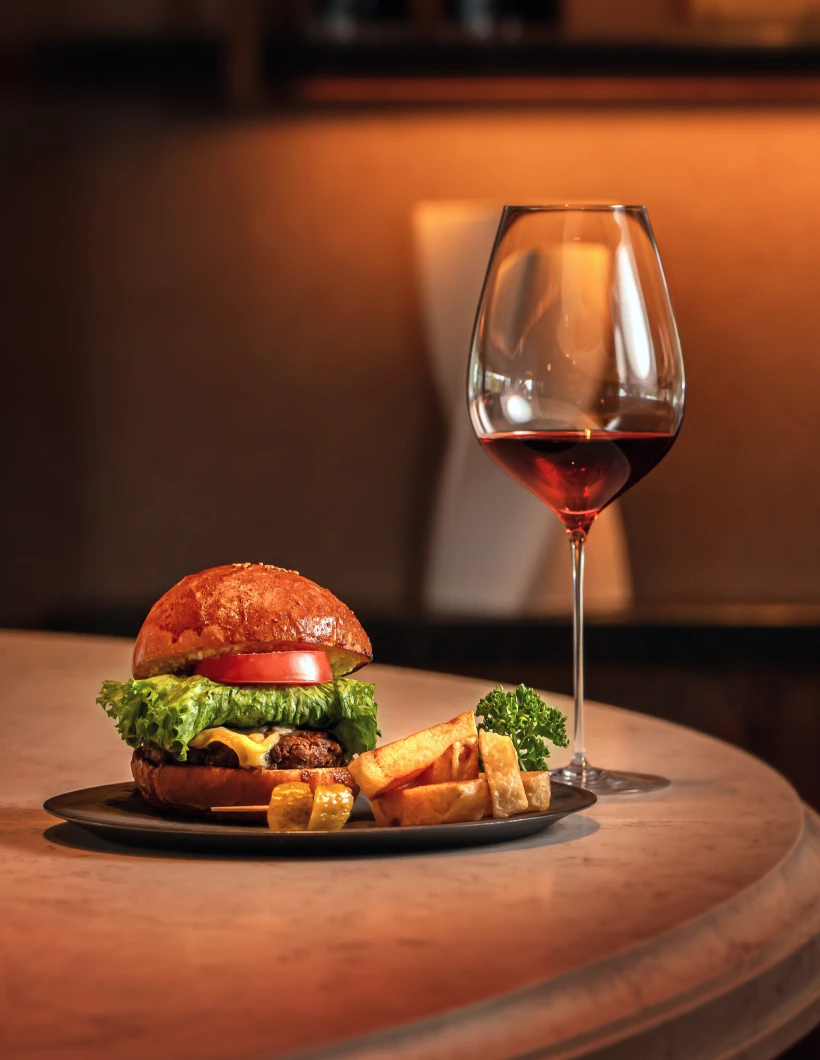 シグネチャーのハンバーガーは、国産牛100%のパティに、隣接した自社ベーカリーで焼き上げたバンズを合わせたここだけの一品。噛みしめるほどに肉の旨味と香ばしさが広がります。さらに臭みがなく脂は控えめなグラスフェッドのサーロインステーキは、赤身の澄んだ旨味が際立つ軽やかな後味で食後の余韻まで美しく整えます。